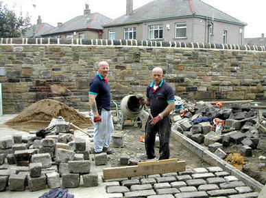 gallery Random walling topped off with hoggs back coping stones with cobbled drive.